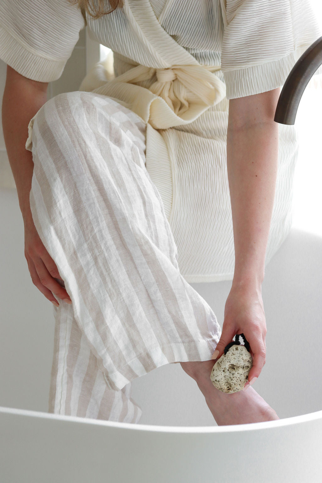 Crafted from natural New Zealand pumice, our Body Stone is a soothing and sustainable exfoliator. Complete with a cotton cord for ease of use, each colour was chosen to reflect the Fat Tui connection with nature and completed with our signature knot. Simply soften feet and elbows in warm water, wet the stone and gently massage in a circular motion for 2–3 minutes.